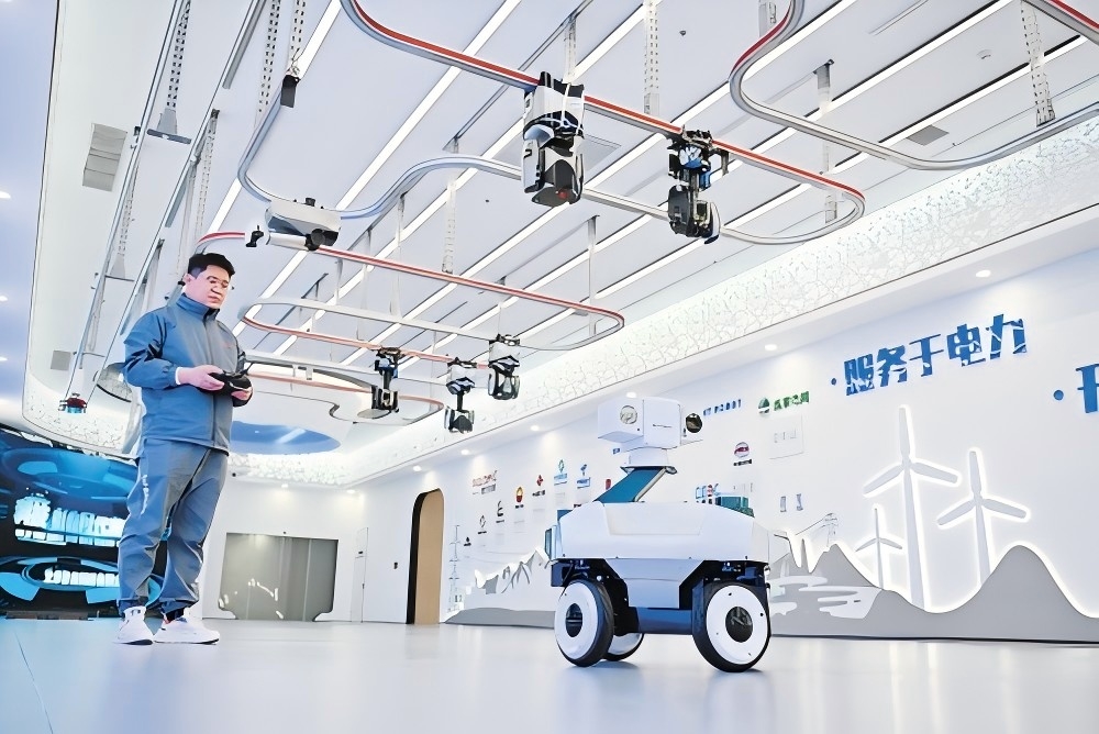在河北雄安新区雄安科创中心中试基地,一家科技企业的工作人员在调试巡检机器人。新华社记者 牟 宇摄