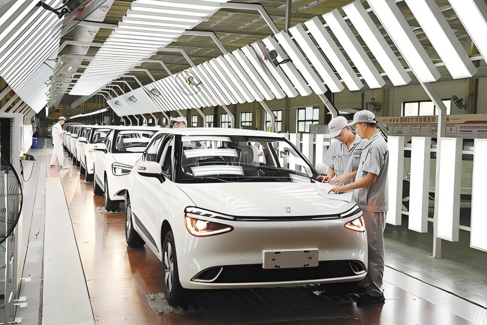 湖北省襄阳市,在一家车企的总装车间里,新能源汽车有序装配下线。谢 勇摄(影像中国)