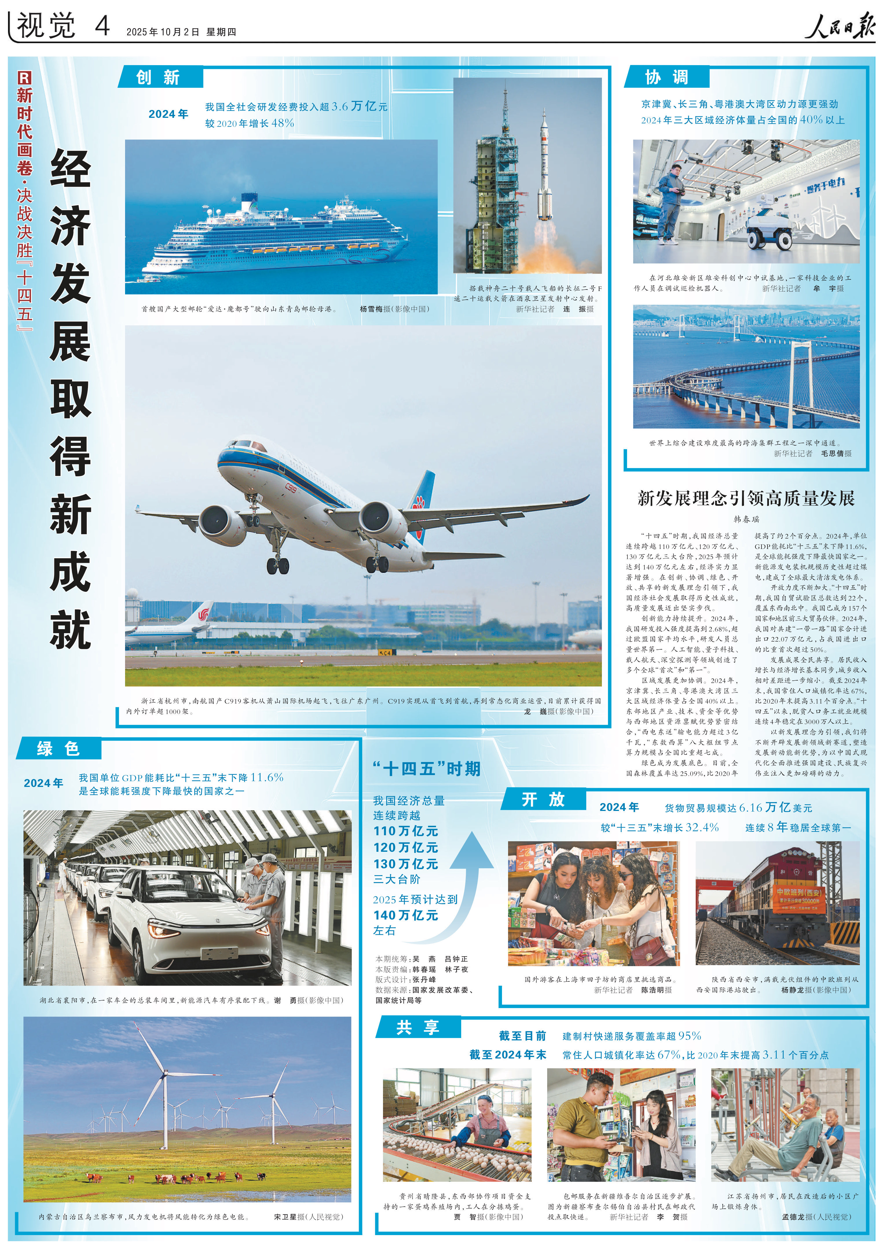 “十四五”时期,我国经济总量连续跨越110万亿元、120万亿元、130万亿元三大台阶,2025年预计达到140万亿元左右,经济实力显著增强。在创新、协调、绿色、开放、共享的新发展理念引领下,我国经济社会发展取得历史性成就,高质量发展迈出坚实步伐。