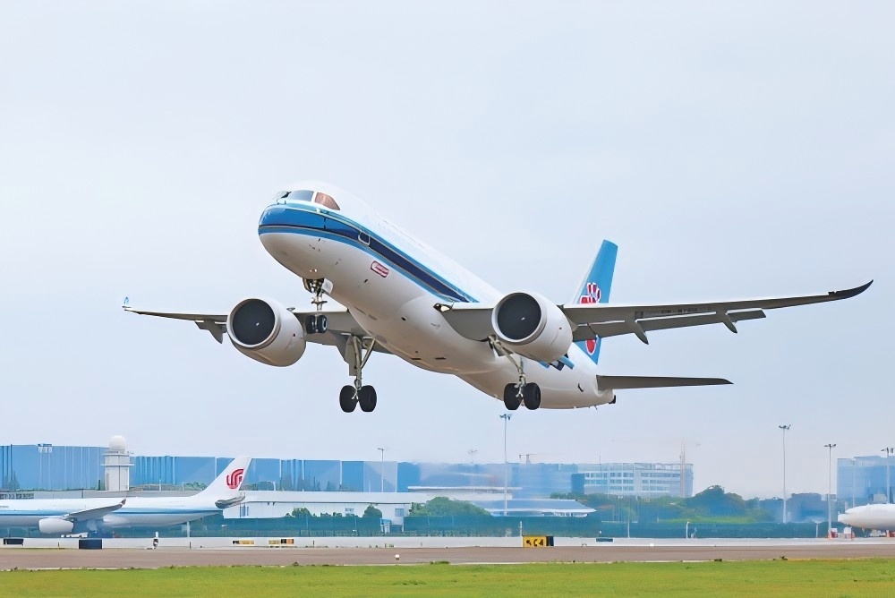浙江省杭州市,南航国产C919客机从萧山国际机场起飞,飞往广东广州。C919实现从首飞到首航,再到常态化商业运营,目前累计获得国内外订单超1000架。龙 巍摄(影像中国)