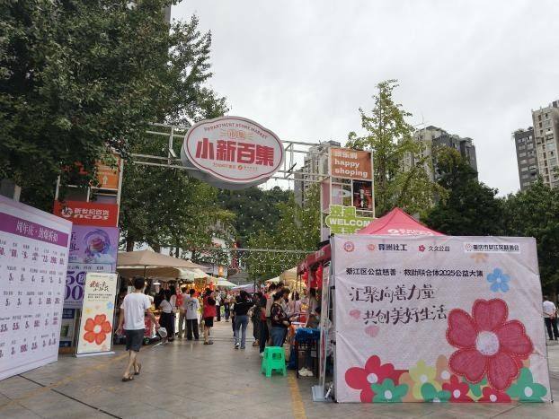 9月19日,在綦江营盘山广场的“小新百集”,一场为期两天的“久久公益大集”的劝募宣传活动温暖启幕。活动邀请了市集内17家商铺成为“爱心商户”,共同为公益发声。活动现场,摊位前的小红花标识牌让整个市集充满了温馨的公益氛围。綦江区慈善会设置了独具特色的爱心义卖摊点,并摆放了公益项目的易拉宝海报,志愿者热情地向过往市民介绍公益项目,并邀请大家参与扫码“捐一元”活动,共同助力綦江乡村梦。