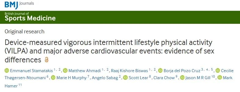 ①Device-measured vigorous intermittent lifestyle physical activity (VILPA) and major adverse cardiovascular events: evidence of sex differences. Br J Sports Med, October 28, 2024
