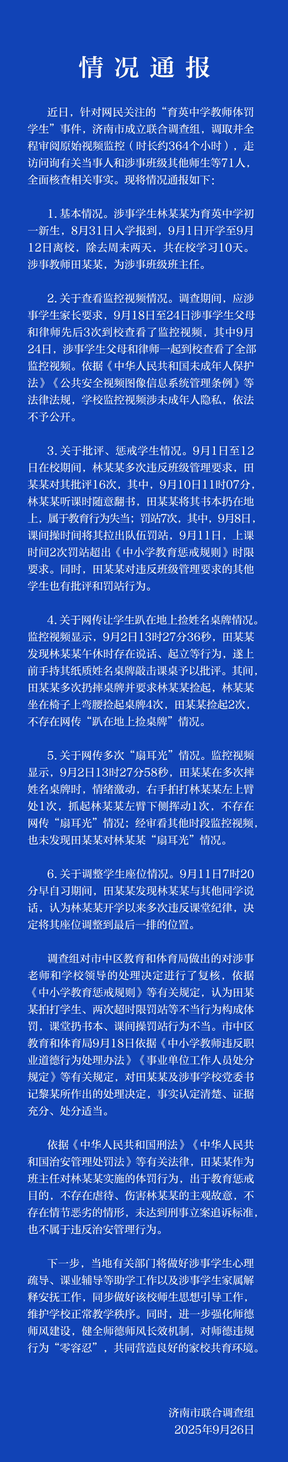 9月26日,山东济南市联合调查组发布“育英中学教师体罚学生”调查结果的情况通报,全文如下: