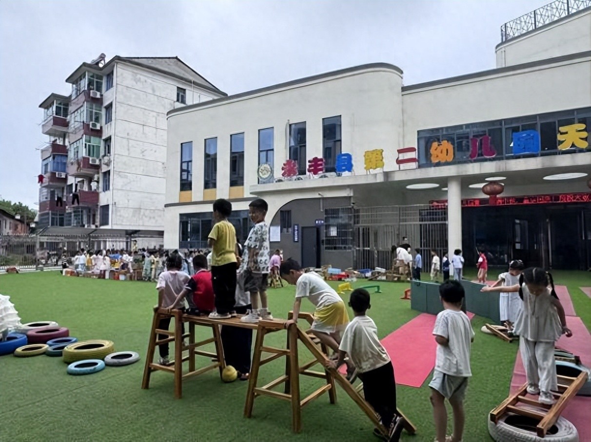 永丰县第二幼儿园的孩子们近日利用纸箱、轮胎等废旧材料,自主协作搭建体能大循环赛道。
