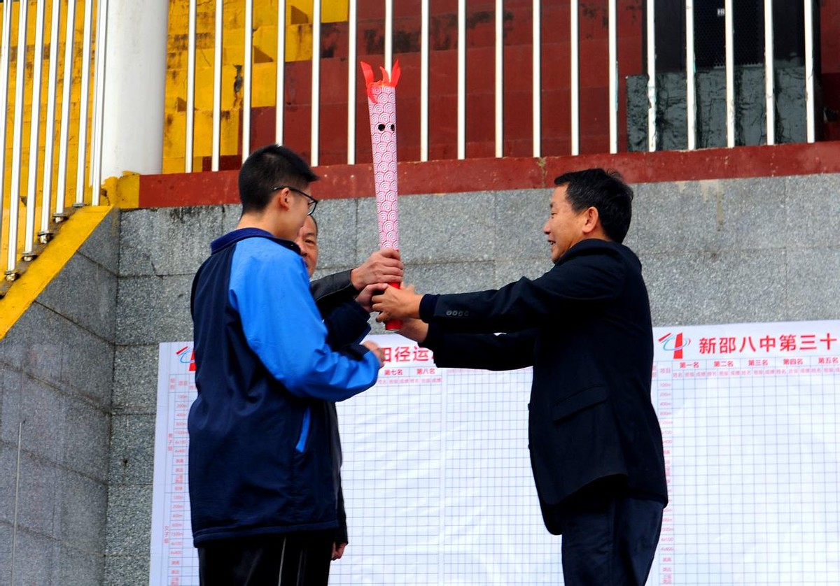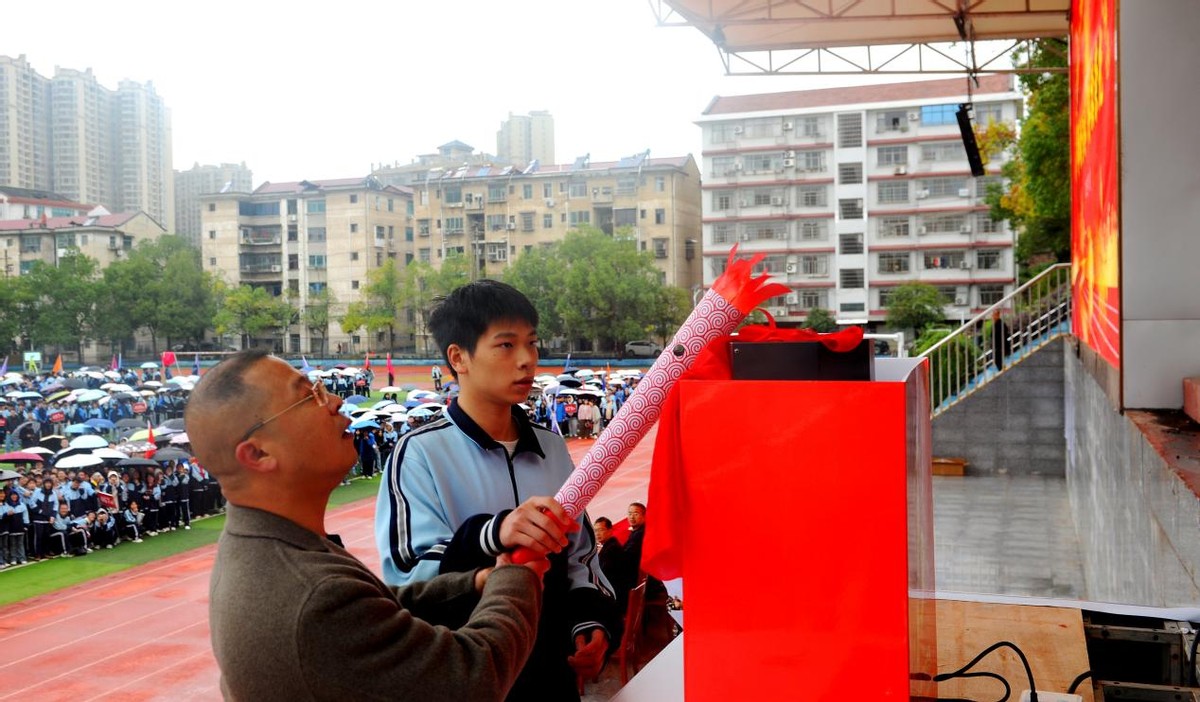 最令人瞩目的当数火炬传递仪式。学校党总支书记刘力耕将承载着希望与重托的火炬,郑重地交给了第一棒火炬手后勤主任黄红根和高一526班的谢璐鹂同学。火炬依次传递,经过第二棒梁文峰老师和高一518班的何晶同学、第三棒彭政林老师和高二496班的李敏同学、第四棒石航行老师和高三468班的刘恋思同学,最终传到了第五棒校长谢艳飞和高三467班的石鑫源同学手中。他们手持火炬,共同点燃主火炬塔。这簇跃动的火苗,既是对32届运动会精神的薪火相传,更是对2026高考征程的壮行礼。