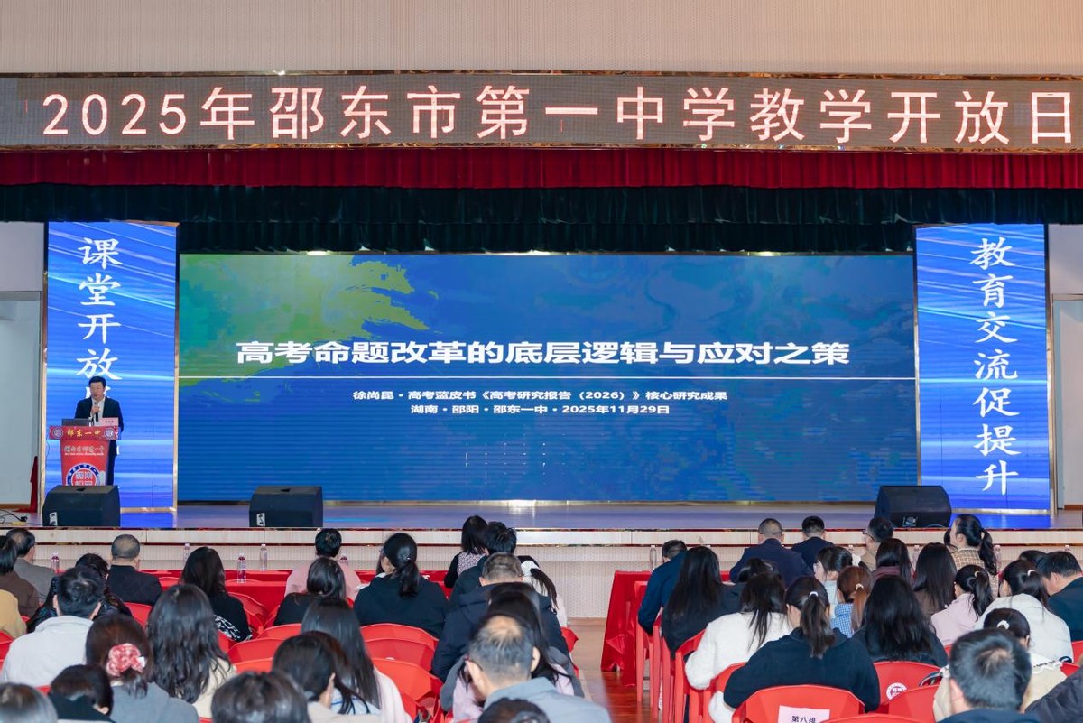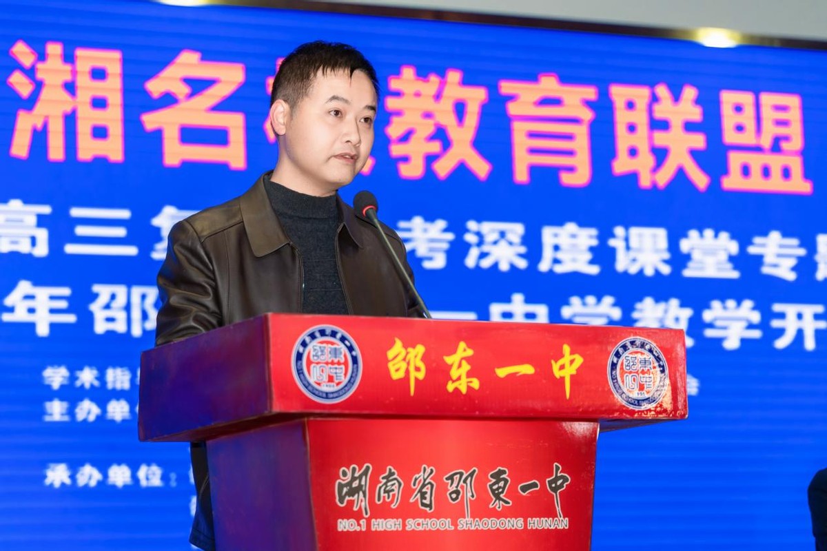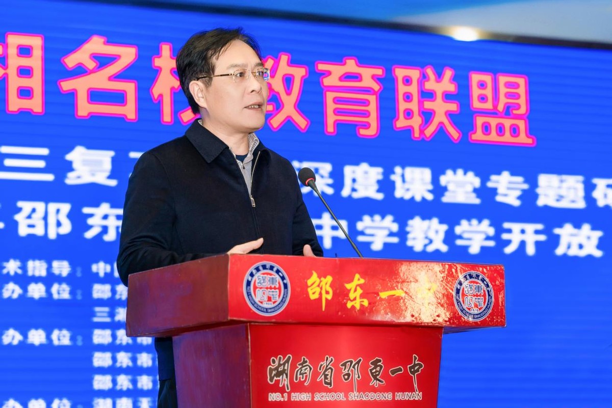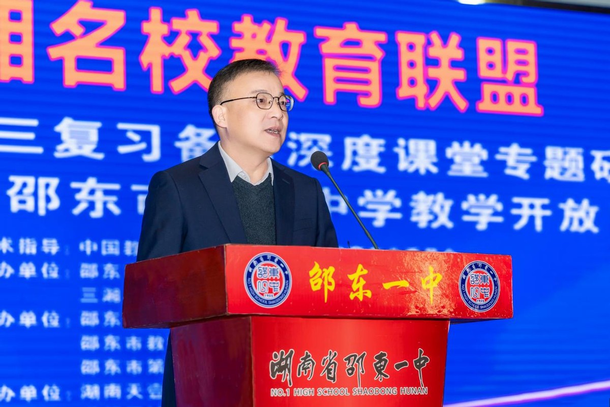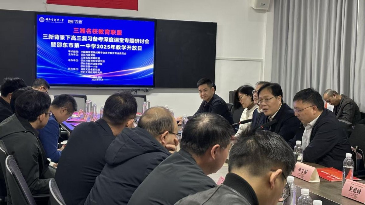 为迎接2026年高考,深入贯彻“素养为基,情境为景,探究创新,回归核心”的新高考命题理念,全面展现联盟学校“四维四环三有”课堂体系,2025年11月29日,由中国教育发展战略学会高中教育专业委员会提供学术指导,邵东市教育局、三湘名校教育联盟主办,邵东市教育科学研究所、邵东市教师进修学校、邵东市第一中学承办,湖南天壹名校联盟、世纪天鸿教育研究院协办的“三新背景下高三复习备考深度课堂专题研讨会暨邵东市第一中学2025年教学开放日”在邵阳市邵东一中隆重举办。本次研讨会汇聚来自全国各地的12位知名教育专家,以及来自20多所三湘名校的书记、校长和教育同仁,大家因“三新”改革而聚,为高三备考而来,旨在加强校际交流,充分展现各校在促进学生全面而有个性发展、推动育人质量全面提升方面的扎实探索与显著成效。
