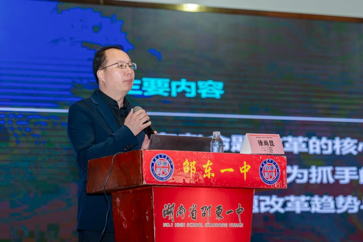 下午,邵东一中教学副校长王孟良主持通识讲座,为参会的所有教育从业人员搭建优质的学习交流平台。首先,高考政策研究专家徐尚昆教授以《高考命题改革的底层逻辑与应对之策》为题展开讲座。针对2026年高考命题的新趋势,他强调,要着力培养学生的可迁移能力以适配社会发展需求,并呼吁全体教师深入钻研学科“三基”(基础知识、基本技能、基本方法),并将其融入日常教学实践,实现备考效率与教学质量的双重提升。随后,长沙教育学院培训部副主任周磊以《智能技术支持下的人机协同备课》为题接续开讲。周主任聚焦AI技术在备课环节的应用价值,表示DeepSeek、豆包等大语言模型的合理运用能够帮助教师显著提升备课效率与质量。他还提醒,教师需强化智能素养与理论认知,明确AI是辅助工具,而非替代教师教学的核心力量。
