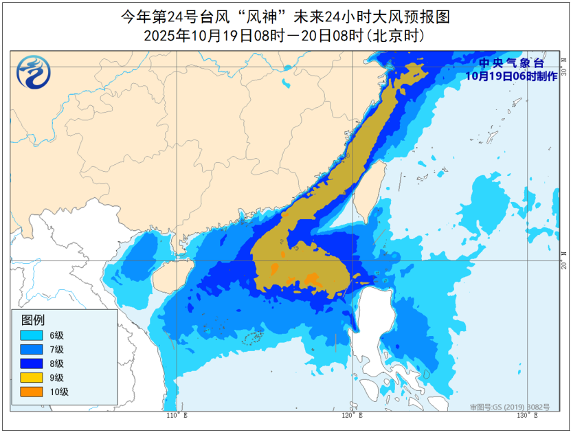 大风预报:受冷空气和“风神”的共同影响,19日8时至20日8时,台湾海峡、巴士海峡、南海北部和中部、西沙群岛、中沙群岛及黄岩岛附近海域、北部湾、琼州海峡、东海西部、浙江沿海、台湾沿海、福建沿海、广东沿海、广西沿海、海南岛沿海将有6-8级大风,阵风9-10级,其中东海西部、浙江沿海、台湾海峡、台湾西部沿海、福建沿海、广东东部沿海和南海东北部的部分海域风力有9-10级,阵风11-12级。
