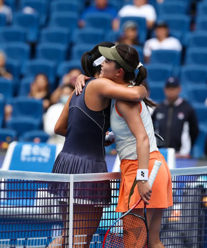9月25日,朱琳(右)和内岛萌夏在赛后拥抱致意。新华社记者 杜昕怡 摄